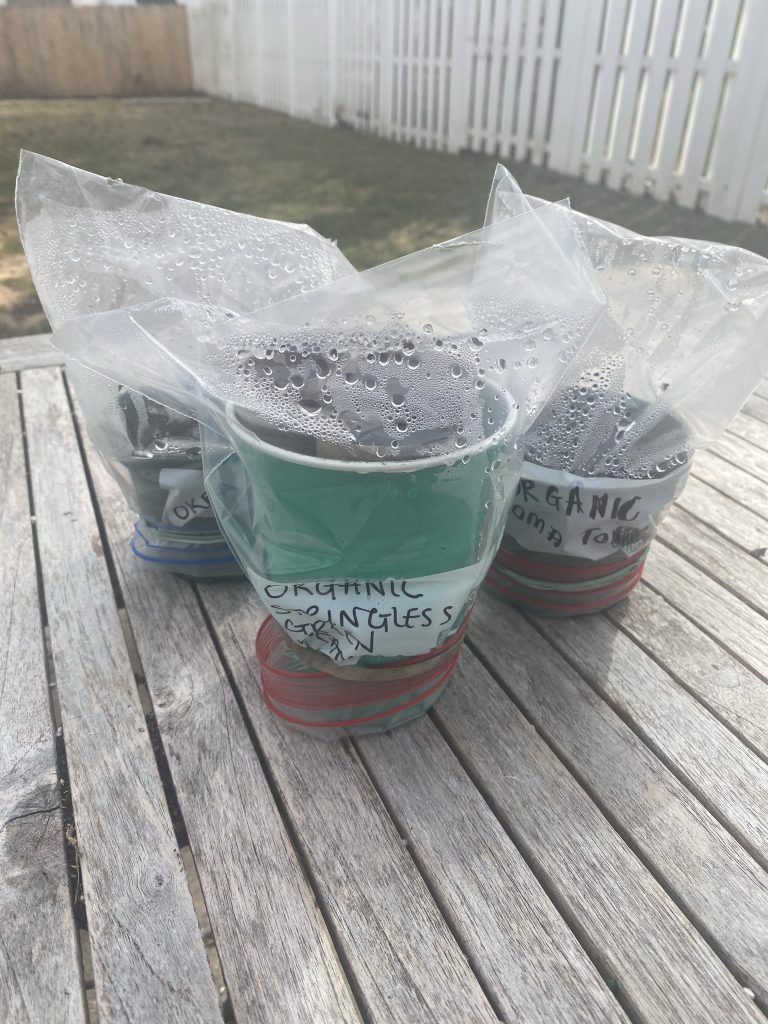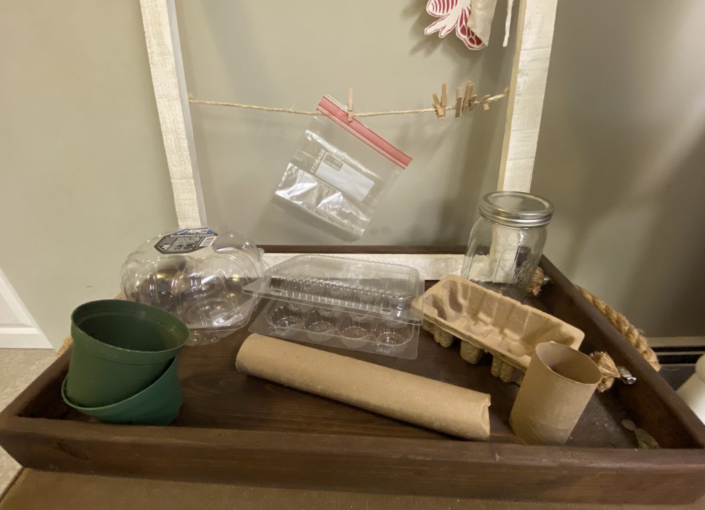We started by searching our kitchen and garage to find different types of single-use packaging that we could use. Good items include the plastic packaging from salads, lettuce, cupcakes, and resusable snack bags. Cardboard is also useful, especially for starting seeds that do not transport well as the cardboard makes a perfect compostable pot! Lastly, hold onto those plastic pots from the nursery, as they can be reused year after year for seeds and seedlings.